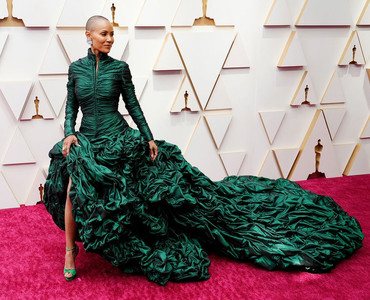Jada Pinkett Smith escogió un impresionante vestido drapeado de color verde esmeralda de alta costura del diseñador francés Jean Paul Gaultier. La original pieza de manga larga y cuello subido destacaba sobre todo por la falda que contaba con un impresionante volumen y una cola infinita. Lo combinó con unos tacones del mismo color de Jimmy Choo y accesorios de Glenn Spiro Jewels. La actriz brilló con su maquillaje a través de una sombra a modo de raya del mismo color del vestido y por su manicura bastante sencilla.