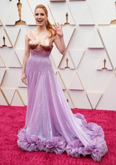 La ganadora del Oscar Mejor Actriz protagonista, Jessica Chastain, apostó por un vestido de tirante ancho que comenzaba con un tono bronce brillante e iba descendiendo con un degradado violeta con pequeñas lentejuelas que aportan más brillo. En el bajo de la falda llevaba flores del mismo color, todo resultado de Gucci.